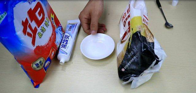 我們先準(zhǔn)備個(gè)容器,擠入牙膏,然后再加入洗衣粉,再加入點(diǎn)面粉,稍微滴幾滴清水用勺子攪拌均勻,然后均勻的涂抹在鞋子開裂斷根的地方,然后再曬兩三天就可以了,